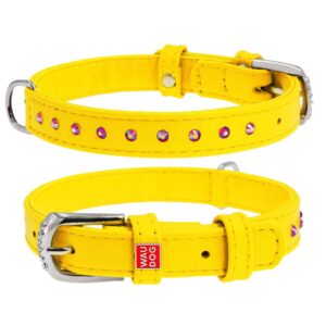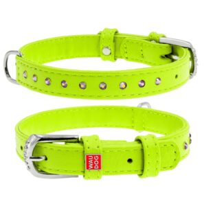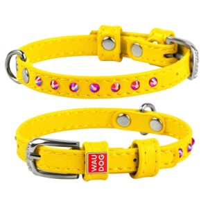 Bright collar for daily walks. Made of soft, natural and high-quality leather. With careful use will last a long time. The circumference of the neck - 18-21 cm, width - 9 mm.