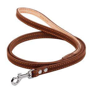 Leash double. Underlying product two layers of strong, rigid and supple skin. In the pen uses an additional layer lining "perchatochnoy" Skin increase comfort for the owner. The length of the product - 122 cm, width - 16 mm.