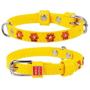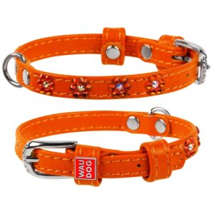 Bright collar for daily walks. Made of soft, natural and high-quality leather. With careful use will last a long time. The circumference of the neck - 18-21 cm, width - 9 mm.