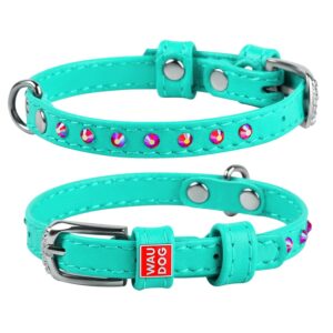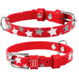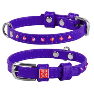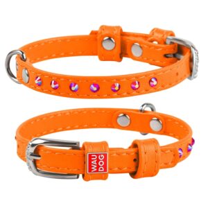 Bright collar for daily walks. Made of soft, natural and high-quality leather. With careful use will last a long time. The circumference of the neck - 18-21 cm, width - 9 mm.