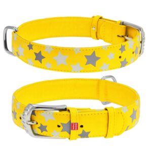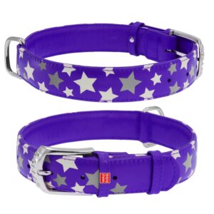 Bright collar for daily walks. Made of soft, natural and high-quality leather. With careful use will last a long time. The circumference of the neck - 46-60 cm, width - 35 mm.