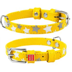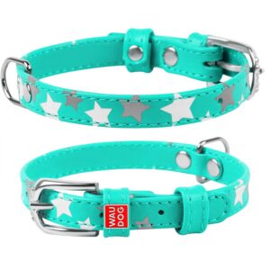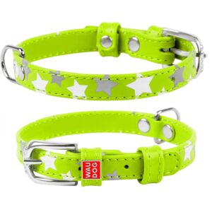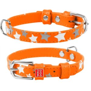 Bright collar for daily walks. Made of soft, natural and high-quality leather. With careful use will last a long time. The circumference of the neck - 27-36 cm, width - 15 mm.