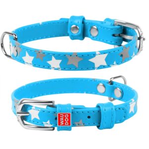 Bright collar for daily walks. Made of soft, natural and high-quality leather. With careful use will last a long time. The circumference of the neck - 19-25 cm, width - 12 mm.