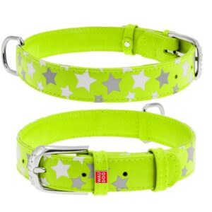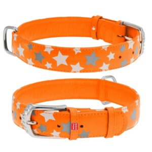 Bright collar for daily walks. Made of soft, natural and high-quality leather. With careful use will last a long time. The circumference of the neck - 46-60 cm, width - 35 mm.