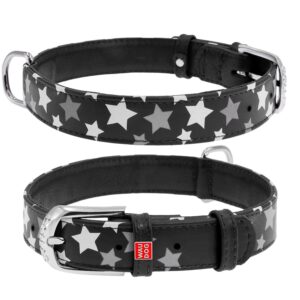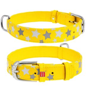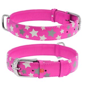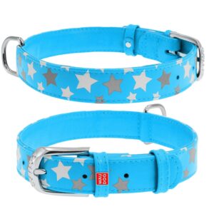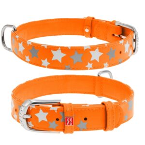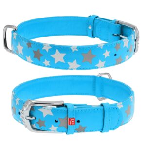 Bright collar for daily walks. Made of soft, natural and high-quality leather. With careful use will last a long time. The circumference of the neck - 30-39 cm, width - 20 mm.