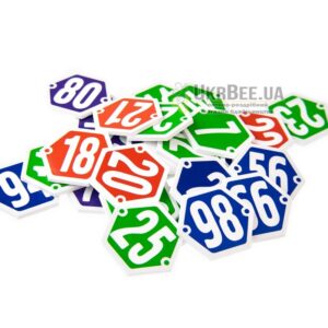 Plastic Figures for sizeing hives in the apiary. White sizes printed on plastic plates. Plates of different colors are shaped cells (hexagons). The 100 hives!