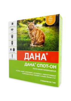 10 – 20 20 – 40 More than 40 kg 3 ml. (3 pipettes 1 ml *) 4.5 ml. (3 pipettes 1.5 ml *) 6 ml. (4 pipettes 1.5 ml *) *) or a combination of pipettes of other volumes. Repeated treatments of animals during the season of greatest activity of parasites are carried out according to indications, but not more often than once a month, with frequent washing of the animal with a detergent (more than 2 times a month) – not more than 1 time in 2 weeks. In order to prevent re-infestation by fleas, animals are replaced by bedding or treated with an approved insecticidal preparation in accordance with the instructions for use. The acaricidal effect of fipronil begins 24 hours after the application of the drug, in this regard, the treatments should be carried out no later than a day before the intended walking of the animal in areas of possible habitation of ticks (parks, squares, forests). To destroy ixodid ticks on the body of the animal, the drug in the amount of 1-2 drops is applied to the tick and the place of its attachment to the skin. If the tick does not spontaneously fall off within 20-30 minutes, it is carefully pulled out of the body and destroyed. For the treatment of dogs, cats and fur-bearing animals with otodectosis (ear scabies), the external auditory canal is cleaned of scabs and crusts, then 3-5 drops of the drug are instilled into each ear, the auricle is folded in half lengthwise and its base is massaged. The treatment is repeated 2-3 times with an interval of 5-7 days. If necessary, repeat the course of treatment. The drug must be injected into both ears, even if clinical signs of the disease are detected in only one ear. When dogs and cats are affected by sarcoptic mange, notoedrosis or demodicosis, the drug is applied in a thin layer to the affected areas of the body previously cleaned of scabs with a swab from the periphery to the center with the capture of borderline healthy skin up to 1 cm, in doses indicated in the table. In a severe course of the disease, it is recommended to treat the animal in a complex manner using pathogenetic and symptomatic drugs. The treatment is carried out 3-5 times with an interval of 7-10 days until the animal’s clinical recovery, which is confirmed by two negative results of acarological studies. Animals with extensive lesions are treated in two doses with an interval of 1 day, applying the drug first to one and then to the other half of the affected body surface. To prevent licking of the drug, animals wear a neck collar, muzzle or close their jaws with a loop of braid, which are removed 20-30 minutes after applying the drug. Do not apply the drug to damp and / or damaged skin, bathe the animal in open water, or wash it with a detergent within 48 hours after treatment. In rare cases, with increased individual sensitivity to the drug and an overdose in animals, profuse salivation, vomiting, muscle tremors and skin irritation may appear. In these cases, the use of the drug is discontinued, its residues are carefully removed with a cotton-gauze swab, the wool is thoroughly washed with soap and water or shampoo. If necessary, the animals are prescribed desensitizing and symptomatic therapy. Contraindication to use is an individual intolerance to the components of the drug, including a history. Patients with infectious diseases and recovering animals, dogs weighing less than 2 kg, kittens and puppies under 12 weeks of age are not subject to treatment. Auricular use of the drug (for ear scabies) is not allowed when the tympanic membrane is perforated. For pregnant and lactating females, Dana Spot-on is used, if necessary, under the supervision of a veterinarian. The peculiarities of the action of the drug during its first use and withdrawal were not revealed. Violations of the drug use regimen should be avoided, as this can lead to a decrease in its effectiveness. If the next treatment is missed, it should be carried out as soon as possible, in the same dose. When using the drug in accordance with this instruction, side effects and complications in animals, as a rule, are not observed. In some animals, with individual hypersensitivity and the appearance of signs of skin irritation and allergic reactions, the drug should be washed off with water and detergent and, if necessary, desensitizing therapy should be carried out. Dana Spot-on should not be used in conjunction with other insectoacaricidal drugs for treating animals. The drug is not intended for the treatment of productive animals. When handling the drug, rubber gloves should be used, especially if there are abrasions and other skin lesions on the hands. Do not drink, smoke or eat during processing. You should not pet the animal and keep it away from small children within 24 hours after using the drug.
