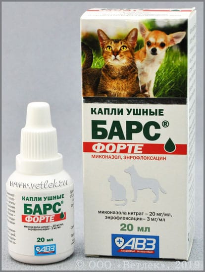 Before treatment, the auricles and the ear canal are cleaned of scabs and impurities with a swab moistened with Bars Forte ear drops, then 3-5 drops of the drug are instilled into each ear (for cats and small dogs – 3-4, medium dogs – 4 and large dogs – 5 drops), fold the auricle lengthwise and lightly massage its base. Processing is carried out 2 times a day for 5-7 days. If necessary, after a week’s break, the course of treatment is repeated.