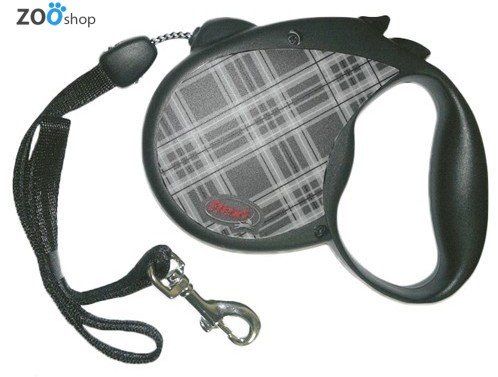 Pretty and practical roulette with lock, black patterned in a cage designed for medium-sized breeds of dogs up to 20 kg. The length of the cable – 5 meters