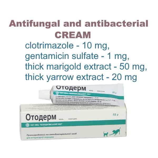 Otoderm is an effective antifungal and antibacterial drug with anti-inflammatory and reparative properties. The antifungal component of the drug clotrimazole (an imidazole derivative), acting on the cell membrane of fungi, disrupts its permeability to amino acids, glucose, phosphates, K + and Na + ions, etc., which leads to the lysis of the microorganism. Clotrimazole is effective against dermatophytes (Trichophyton rubrum, Trichophyton mentagrophytes, Epidermophyton floccosum), yeast-like (Candida albicans, Candida pseudotropicalis, Candida neoformans) and molds (genus Aspergillus). Gentamicin is an aminoglycoside antibiotic, part of the drug, potentiates the action of the drug against gram-positive staphylococci (including those resistant to penicillin and cephalosporins) and streptococci. It affects some gram-negative bacteria (Bacteroides spp., Malassezia pitiriformis, Malassezia pachydermatis, Malassezia furtur, Corinebacterium minutissimum, Pseudomonas aeruginosa). Extracts of calendula and yarrow accelerate the processes of regeneration and epithelialization of damaged tissue. The hydrophilic base, which has a high hyperosmolar activity, promotes the absorption of inflammatory exudate, thereby reducing the concentration of bacteria in the focus of inflammation, the toxins they release, and decay products of necrotic tissues. Otoderm belongs to practically non-toxic drugs (class V toxicity).