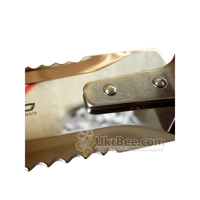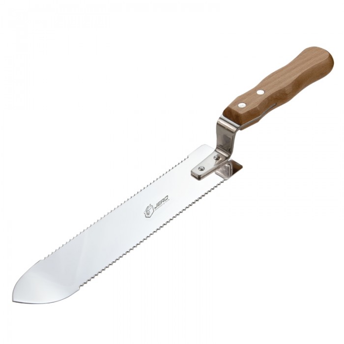 Jero knife blades are made of stainless steel. The blade of the knife can be sharpened in the form of teeth on one or both sides. In order that would choose the right type of grinding in the order they need a suitable model. Blade length can be 25 or 28 centimeters, the choice of beekeeper. Cutting all the seals in one run is made possible by a knife blade nose that is slightly elevated relative to the plane of the honeycomb. Spout knife bent thus not affected by the bar and not stuck comb. The handle of the knife is of two types – plastic or hardwood. In the original blade knife must be present logo – Jero Beekeeping depicting bees.