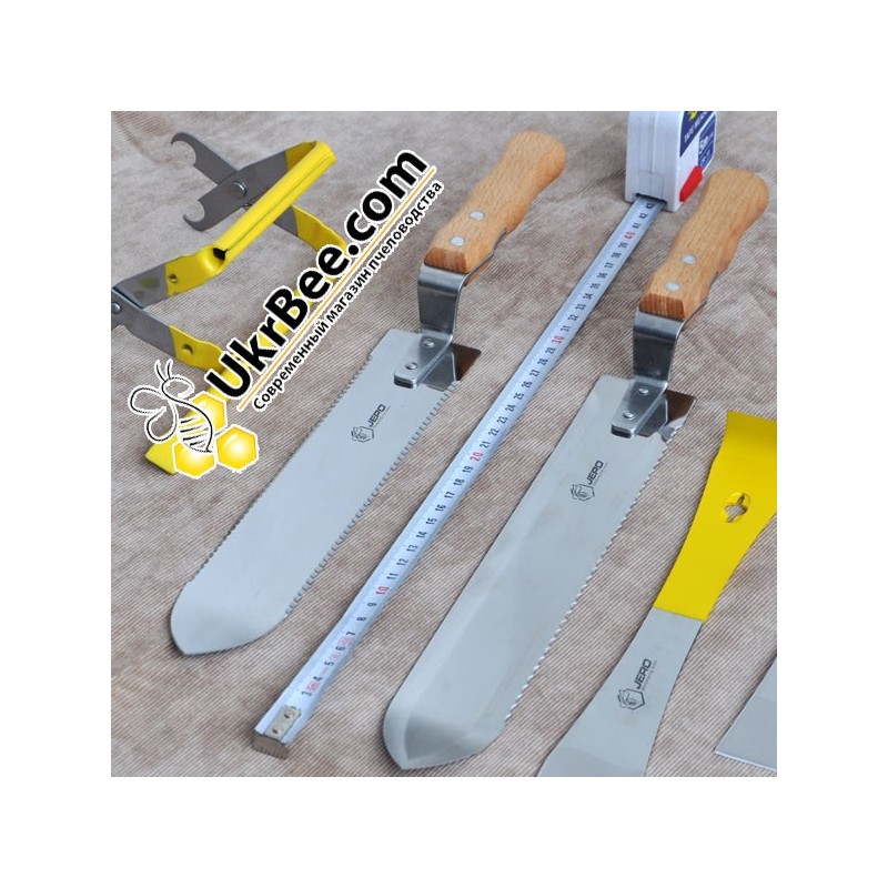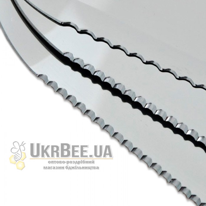 knife blades are made of stainless steel. Sharpening the blade can be shaped teeth on one or both sides of the blade. To select the type of sharpening required in order specify the model. Blade length may be 25 or 28 centimeters choice beekeeper. Spout knife slightly raised relative to the plane of honeycomb, which is very useful when using a knife for cutting all seals in one run with a knife.