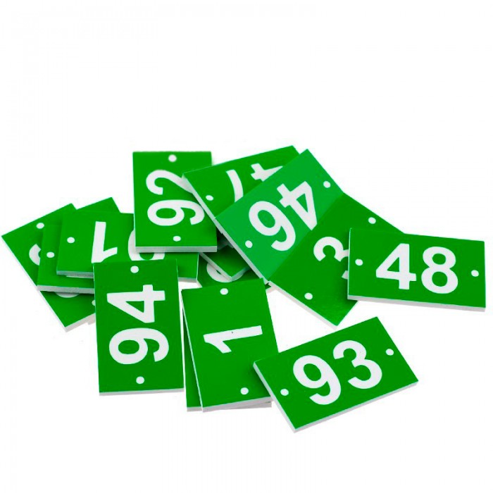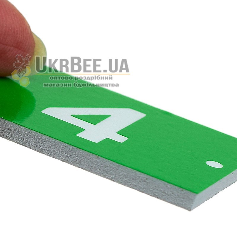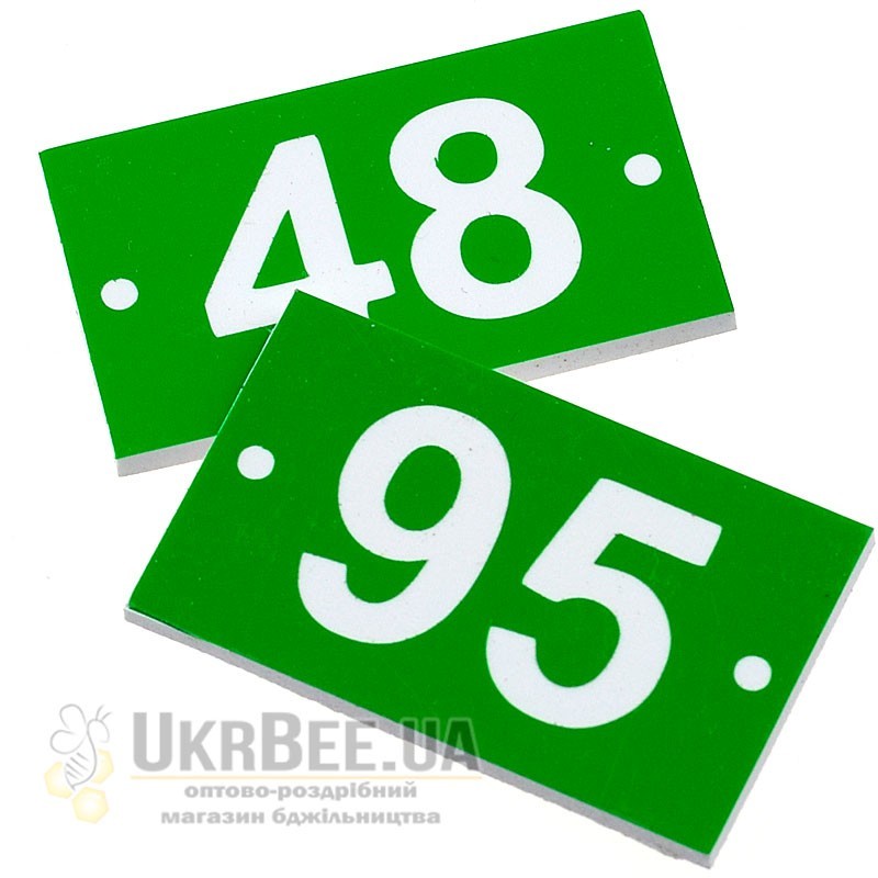 size plates for hives made of PVC plastic. In the shape of a rectangular plate size 30h50 mm thickness – 3 mm. The front side is covered with glossy film green, white figures (without film). Tablets are sizeed from 1 to 100.