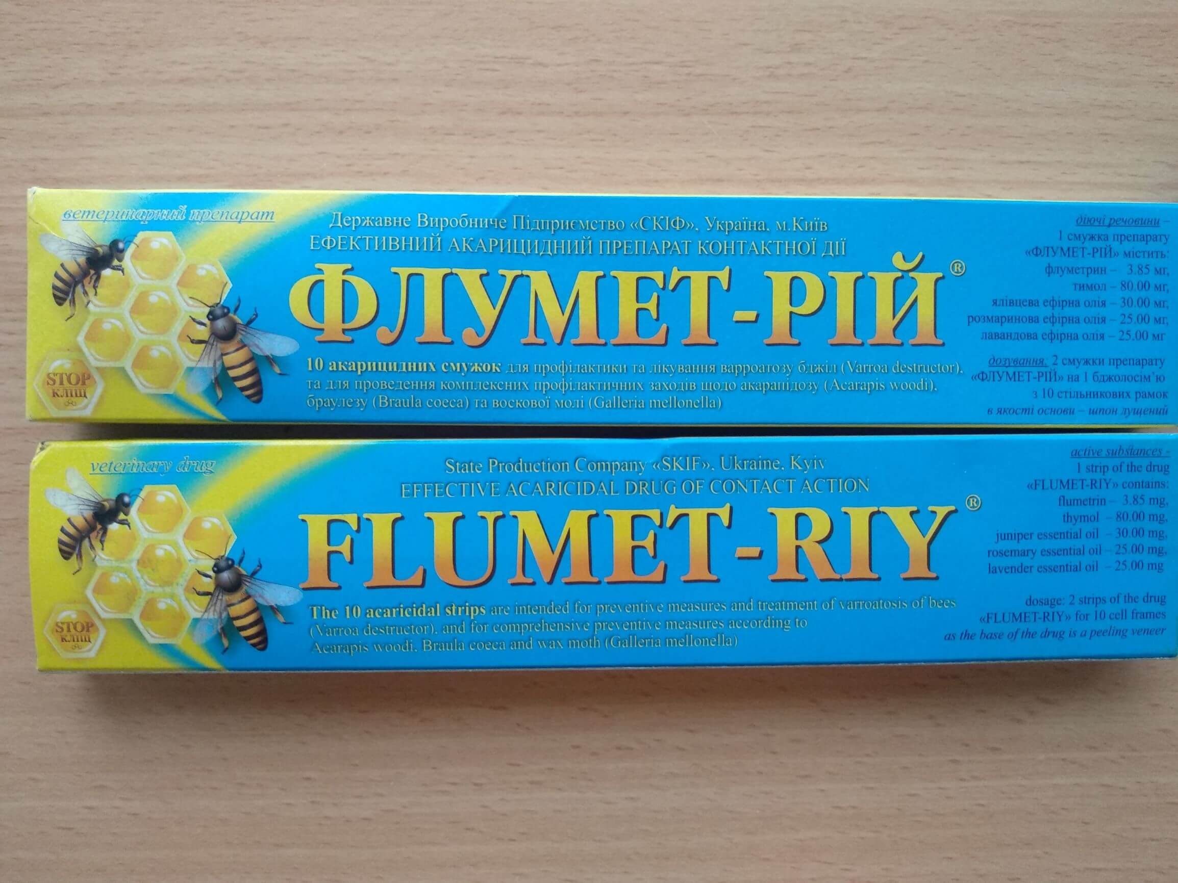 Indications for use: Flumet-Riy is intended for the diagnosis and treatment of varatosis (Varroa destructor), as well as for carrying out complex preventive measures for acarapidosis (Acarapis woodi), brucellosis (Braula coeca) and wax moth (Galleria mellonella).