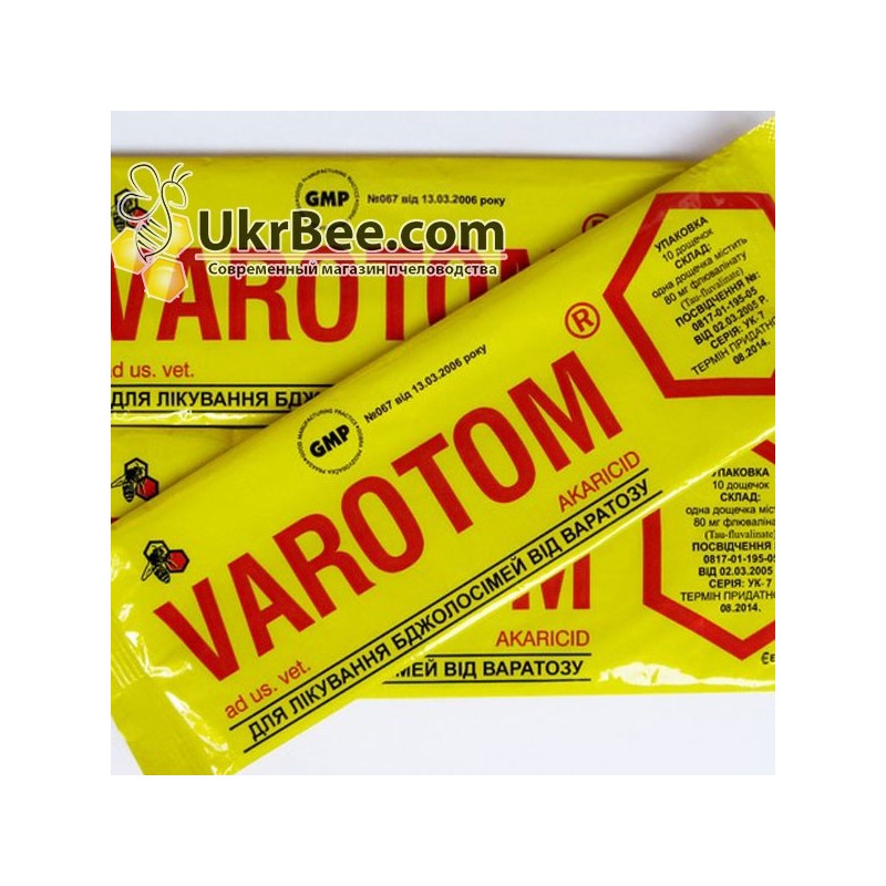 Effective preparation for combating varoa mite in bees. Varotom works thanks to the “Fluvalinat” substance, which the strips are impregnated with. Each strip contains at least 80 mg of fluvalinate, which is enough to kill the tick population in the bee colony. Varotom is produced in the form of wood strips impregnated with the active substance. When placing the strip in the hive, place the strip in the middle between the combs. Thus, more bees will be able to touch the strip, thereby becoming carriers of the active substance. To kill ticks (up to 98-99%) in a bee colony, it is enough that only 10% of the bees touch the strip and spread the Fluvalinat substance throughout the hive.