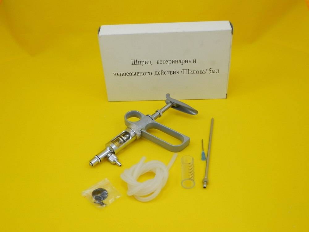 Shilov’s device is incredibly common and has been used by professional veterinarians for a long time. It is a metal structure for a 5 ml syringe. The barrel and the handle of the syringe are made of iron.