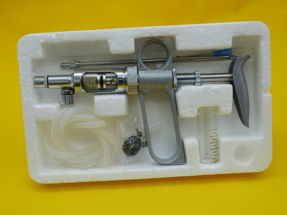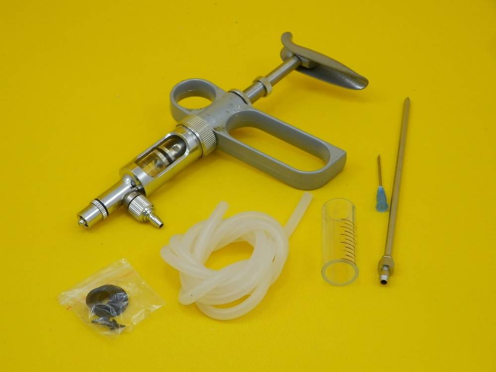 The syringe is designed for mass injections of liquid medicines to farm animals.